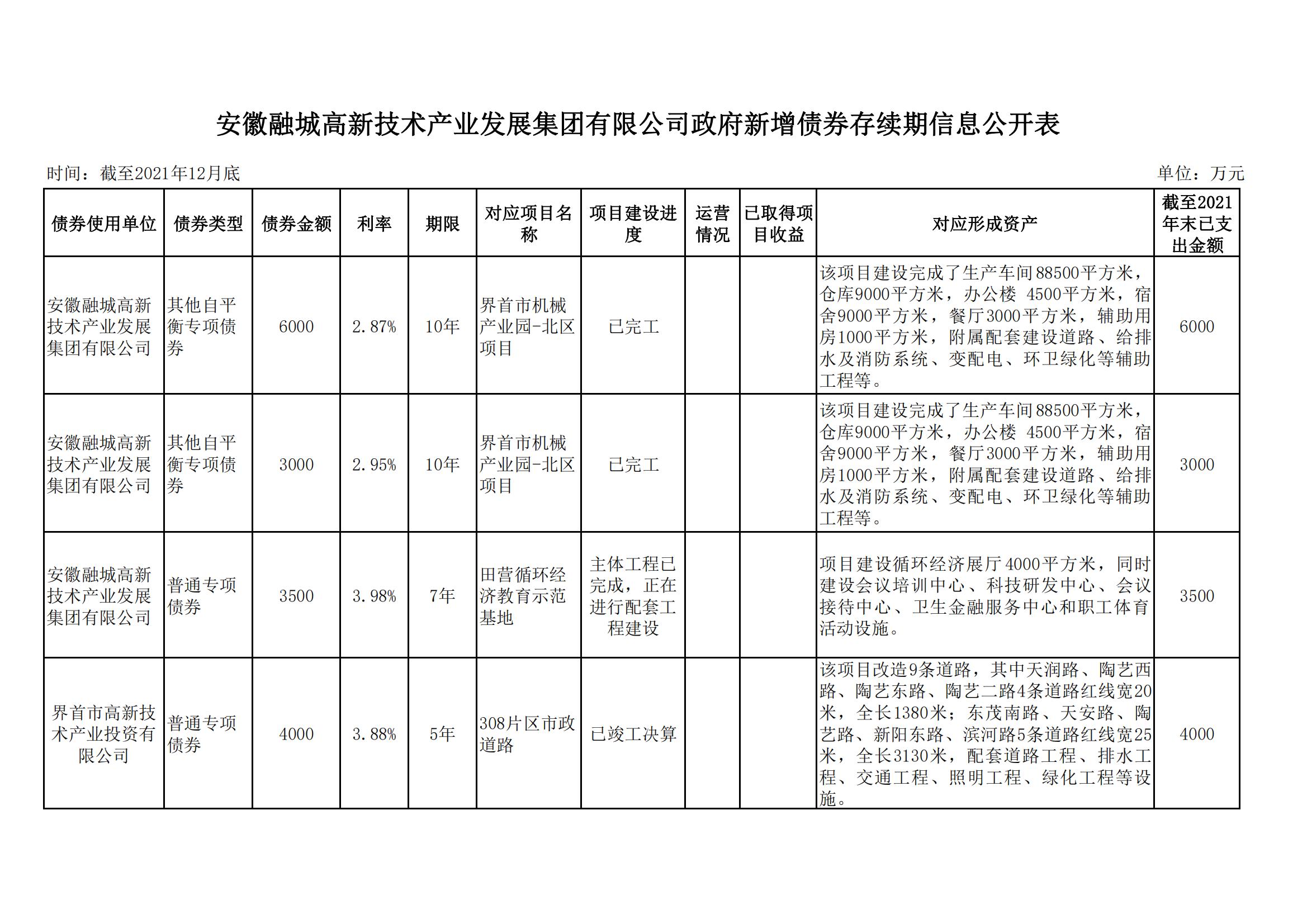 安徽融城高新技術產業發展集團有限公司政府新增債券存續期信息公開表